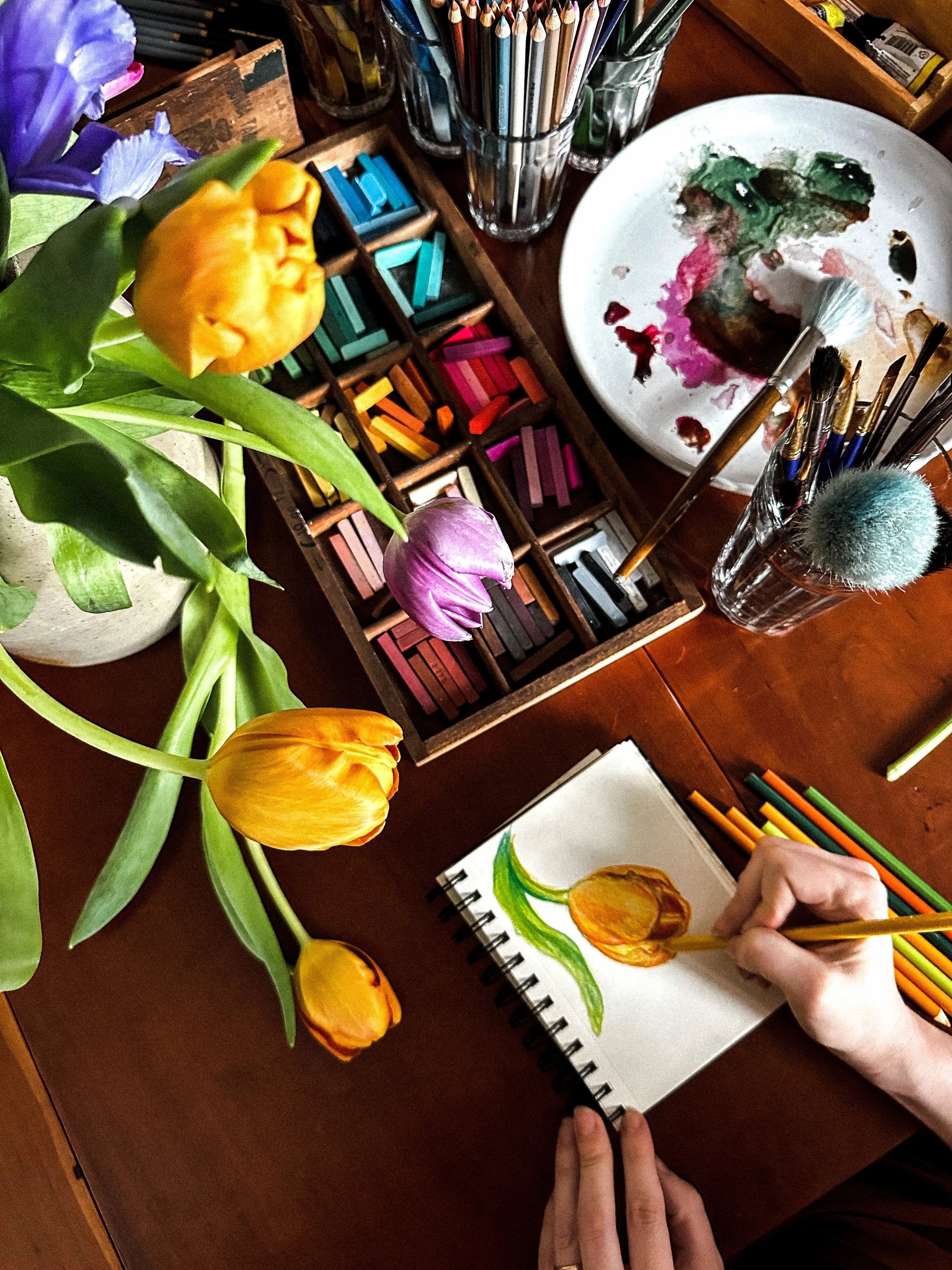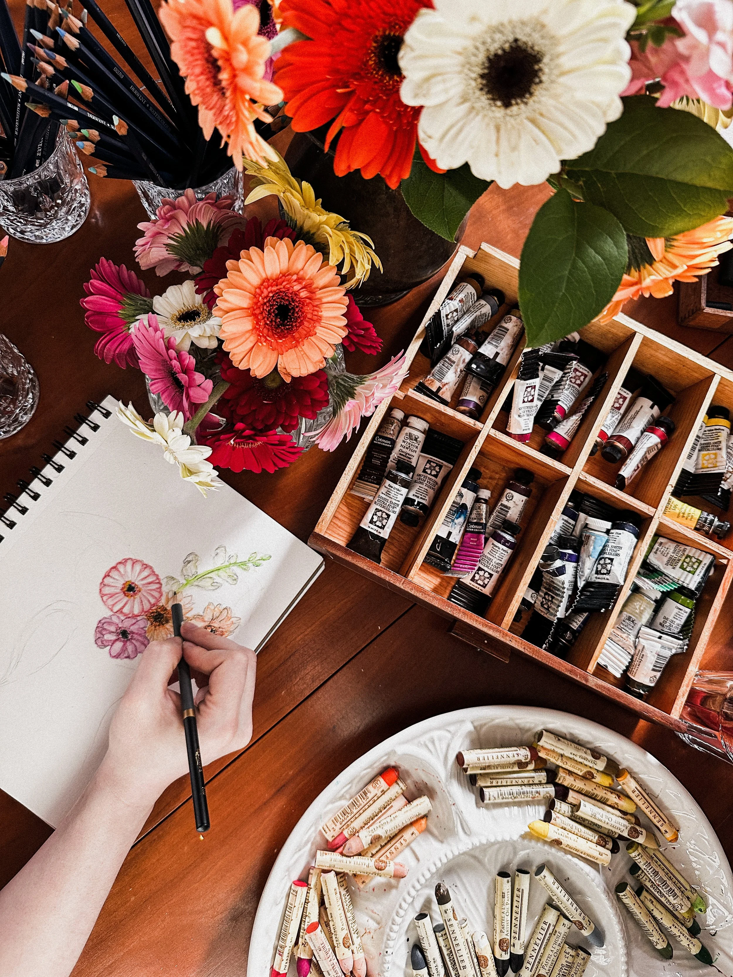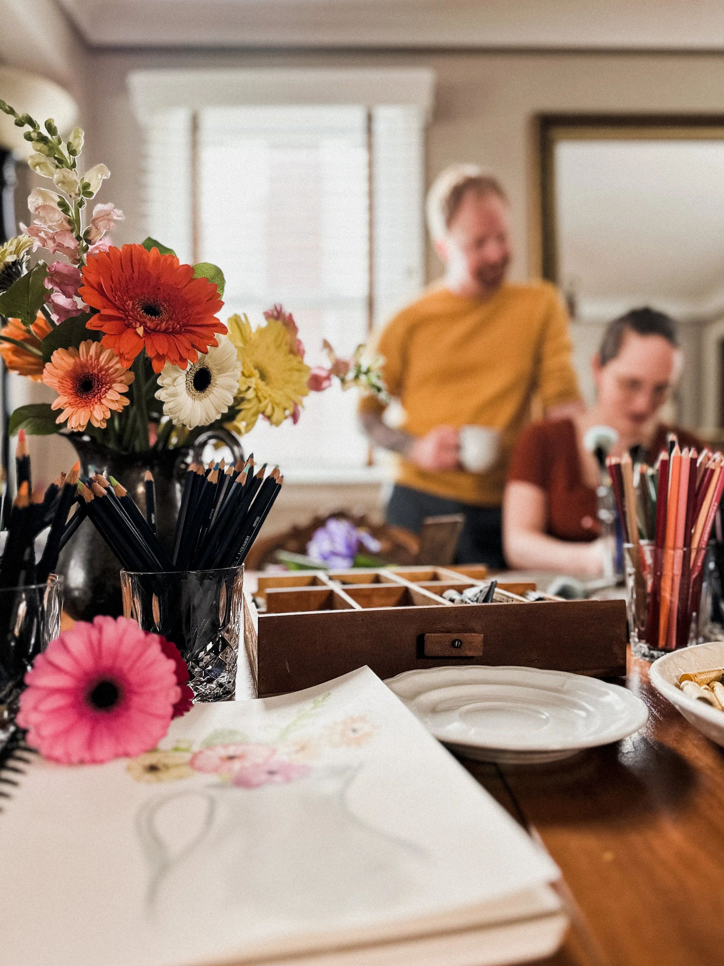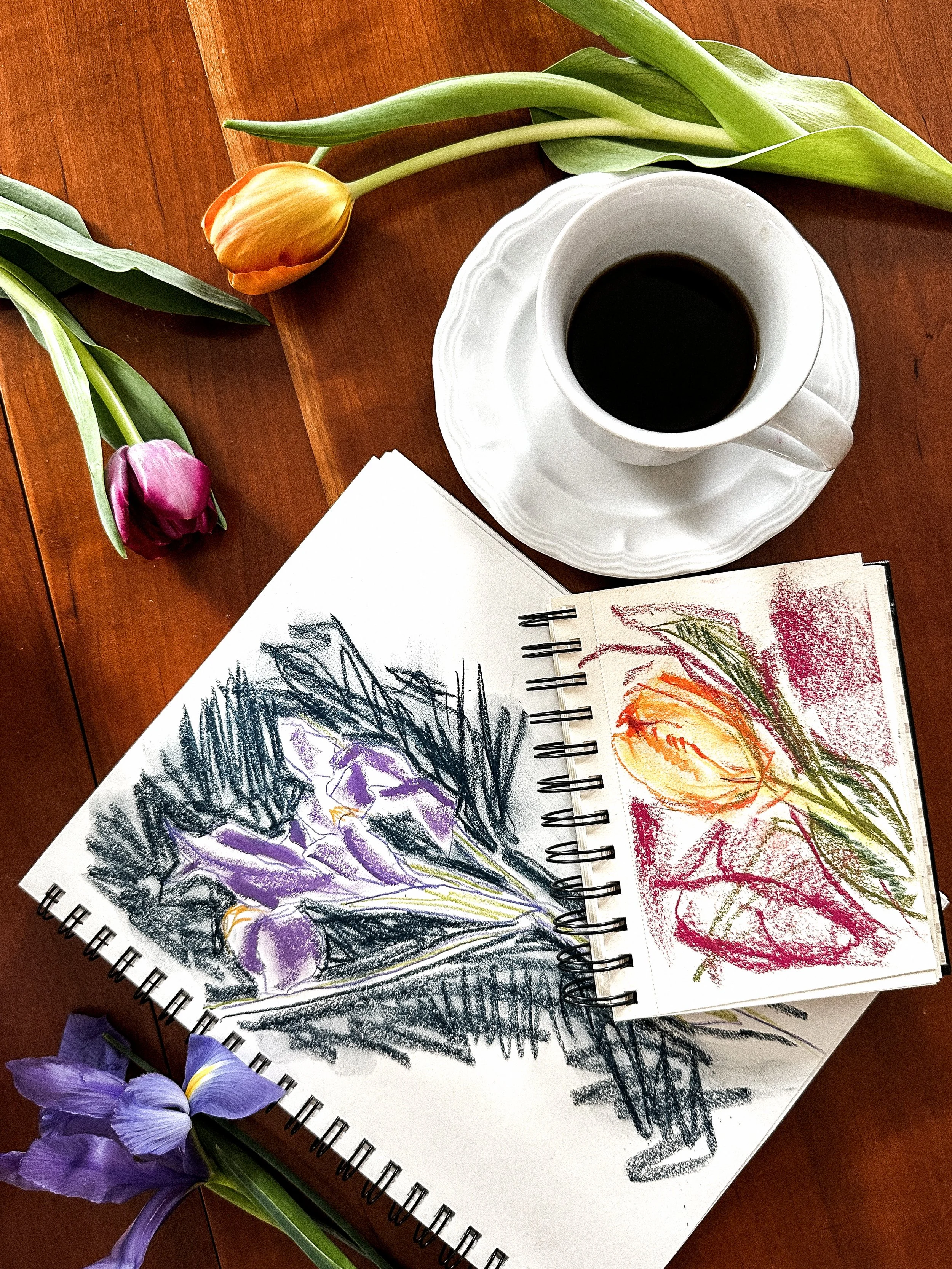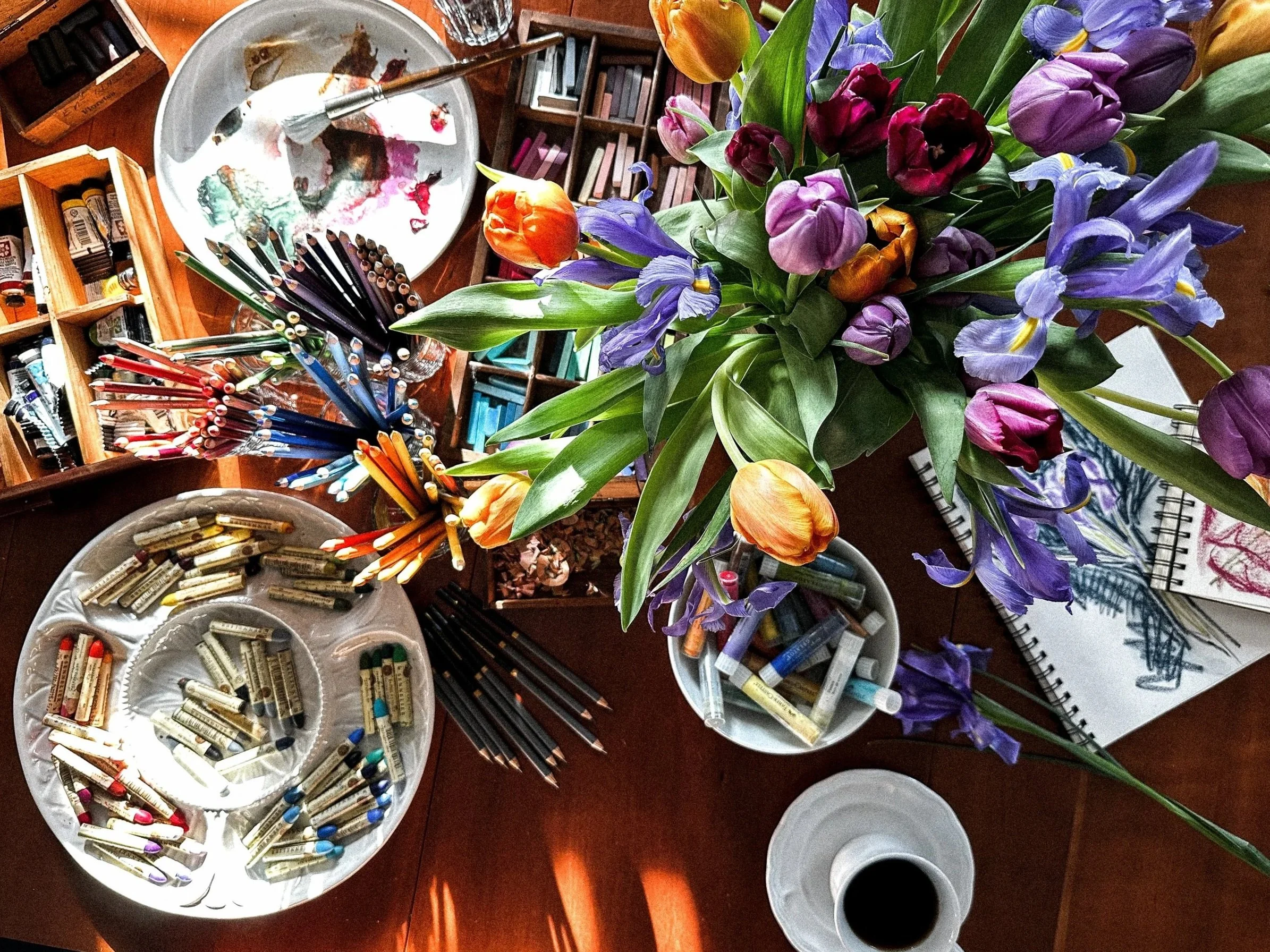 Imagine walking into your local coffee shop, but instead of being greated by patrons glued to their phones and laptops, there is a beautiful arrangement of seasonal flowers center stage. On a nearby table there is an overflowing assortment of art supplies: pencils, oil pastels, conte, charcoal, watercolors, soft pastels and so on.