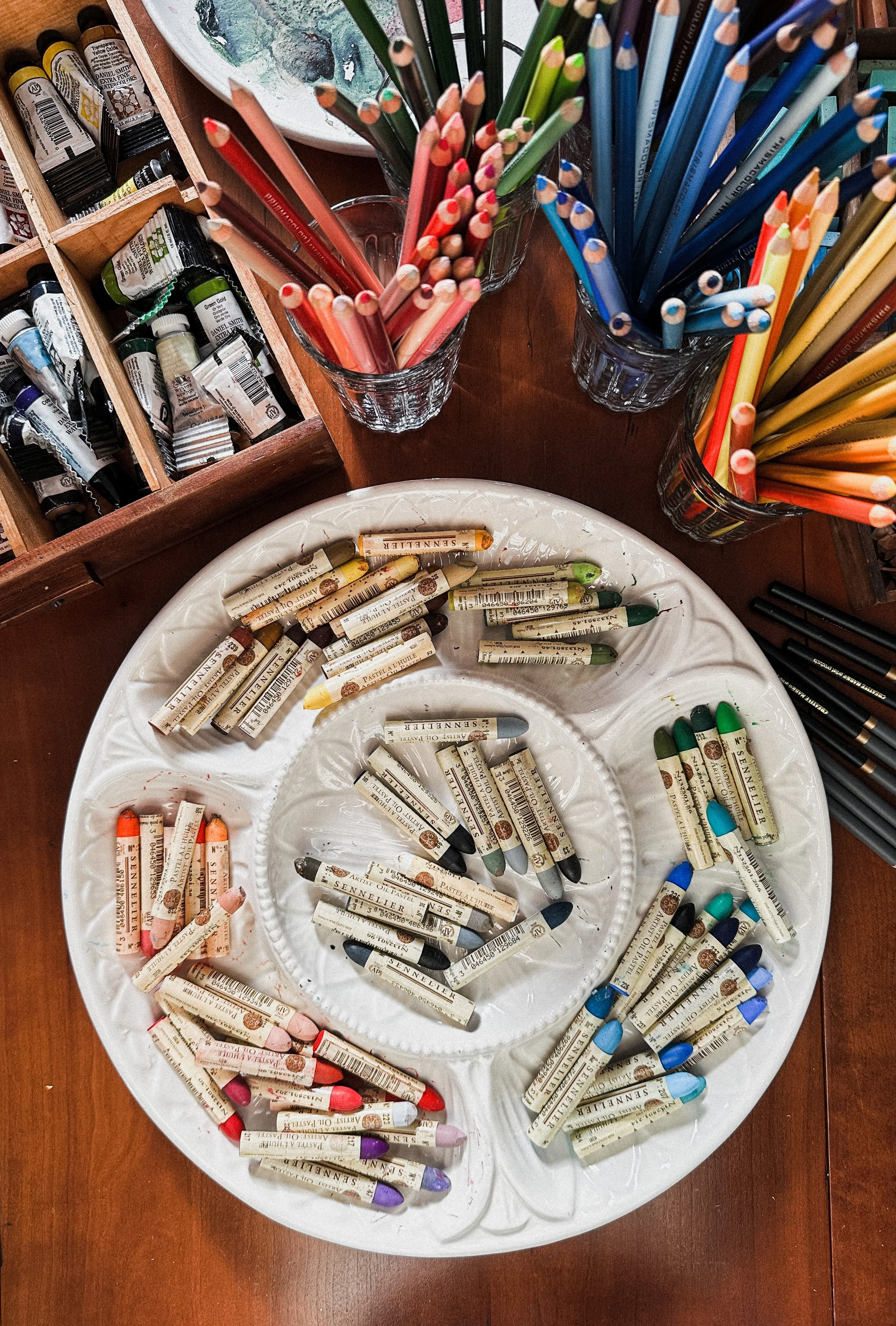 Everything you need to create your own unique work of art. Think prismacolor pencils, soft pastels and oil pastels, charcoal pencils, conte crayon, watercolors and an assortment of paper.